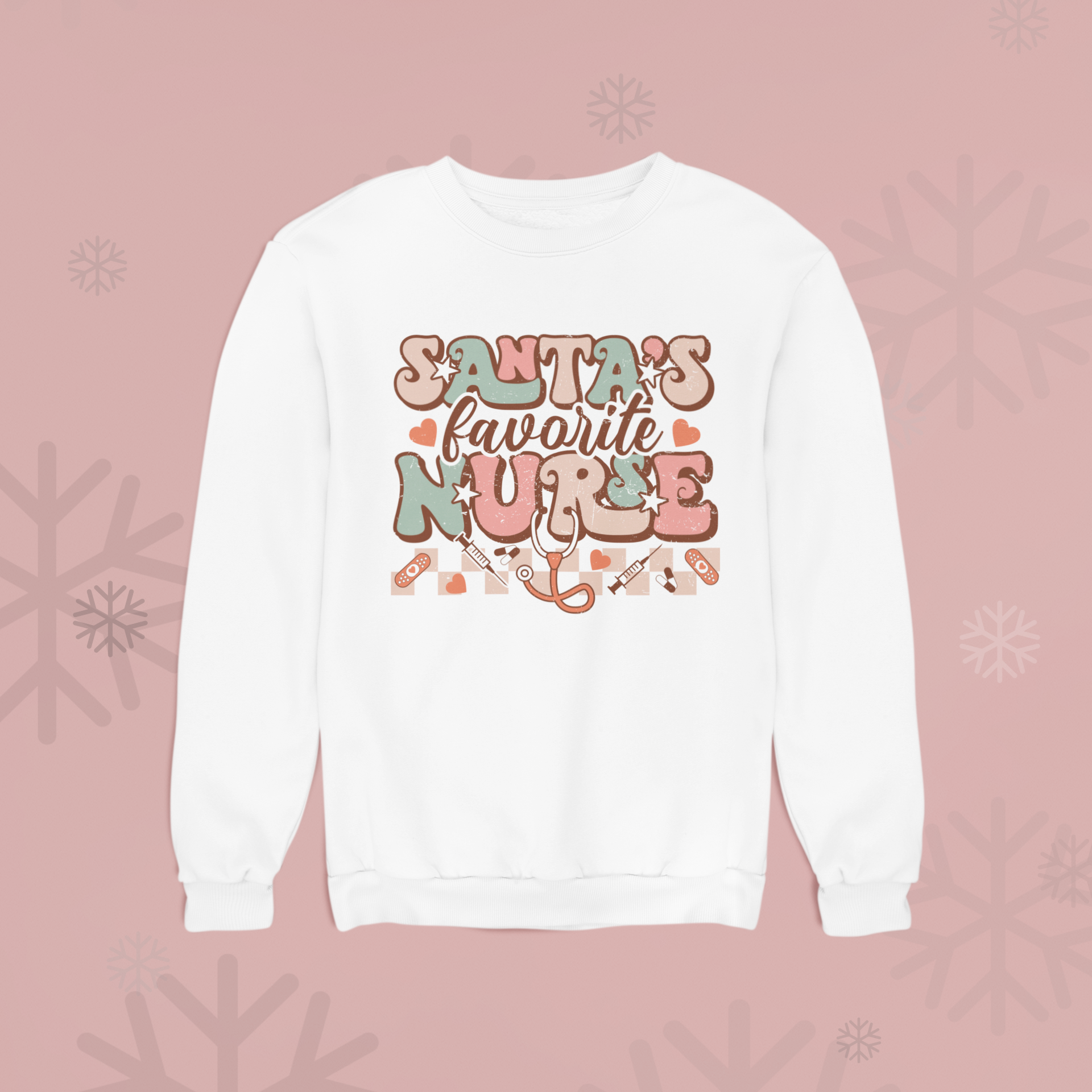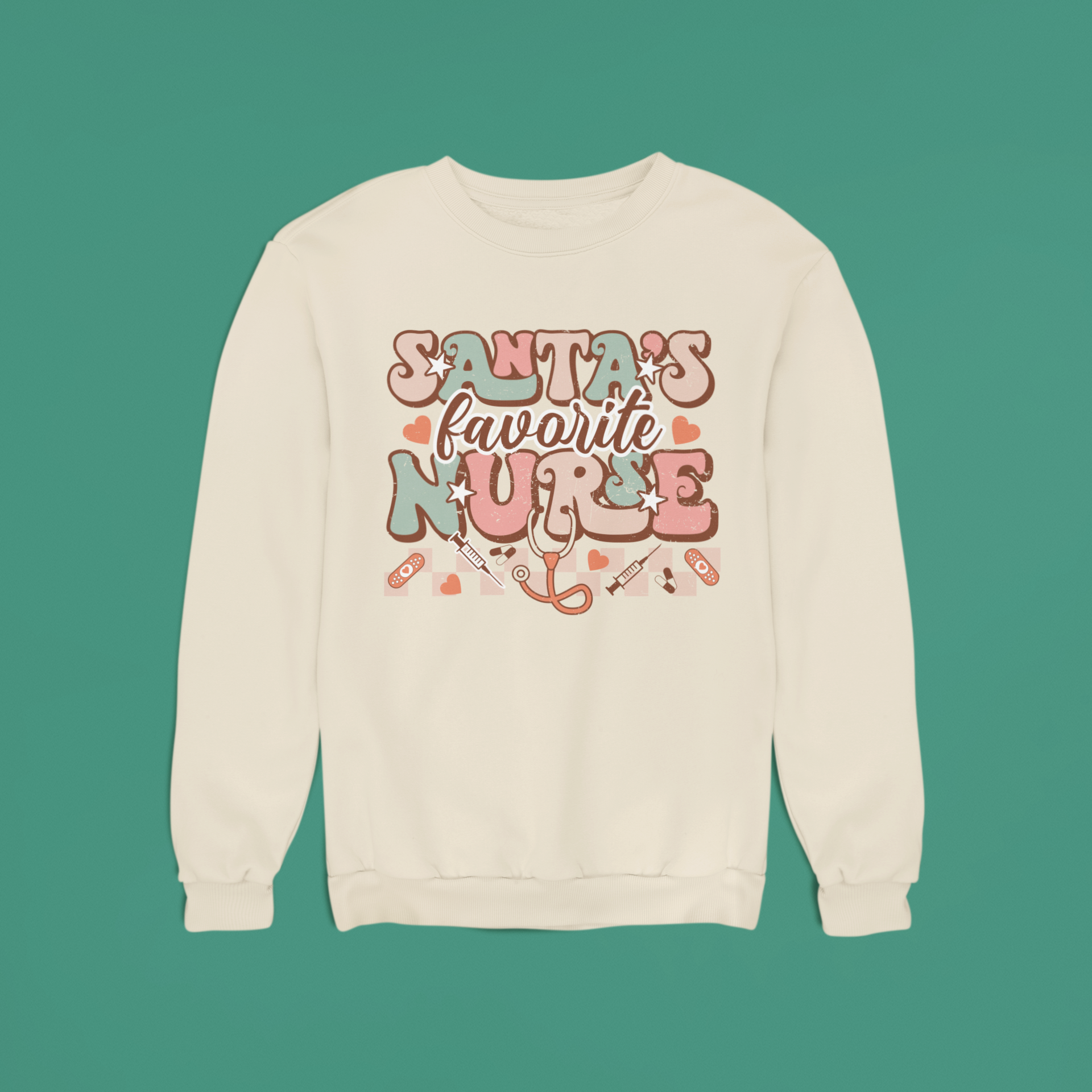 'Tis the season for this festive and cozy Santa's Favorite Nurse Retro Christmas Crewneck! Spread some holiday cheer while celebrating your love for nursing in style. Made with soft and comfortable material, this crewneck is perfect for all your seasonal gatherings and gift exchanges. (Nurse approved!)